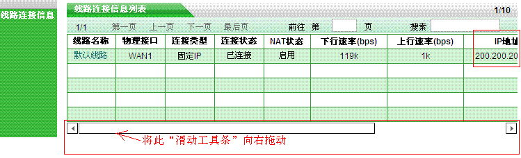 不同的路由器中,查看WAN口IP地址的選項(xiàng)會(huì)有一些不同,大家在自己的路由器中,注意查找到“上網(wǎng)設(shè)置”、“WAN口設(shè)置”、“聯(lián)網(wǎng)狀態(tài)”、“Internet設(shè)置”等選項(xiàng),一般在這些選項(xiàng)下面,可以查看到WAN口IP地址。下面以幾個(gè)常見(jiàn)品牌為例,說(shuō)明如何查看對(duì)外路由器獲得的WAN口IP地址。 1、查看TPLlink路由器WAN口獲取到的IP地址 打開(kāi)瀏覽器,輸入以上網(wǎng)址,登錄路由器界面,點(diǎn)擊 運(yùn)行狀態(tài) > WAN口狀態(tài),可以查看到WAN口獲取的IP地址,如下圖: ![]() 2、查看騰達(dá)路由器WAN口獲取到的IP地址 打開(kāi)瀏覽器,輸入以上網(wǎng)址,登錄路由器界面,點(diǎn)擊 運(yùn)行狀態(tài) > WAN口狀態(tài),可以查看到WAN口獲取的IP地址,如下圖: ![]() 3、查看艾泰路由器WAN口獲取到的IP地址 打開(kāi)瀏覽器,輸入以上網(wǎng)址,登錄路由器界面,點(diǎn)擊 “基本配置”-“線路配置”,可以查看到WAN口獲取的IP地址,如下圖: ![]() 在線路連接信息列表中,查詢“默認(rèn)線路”的IP地址。將線路連接信息列表中將“滑動(dòng)工具條”向右拖動(dòng),如圖所示: ![]()