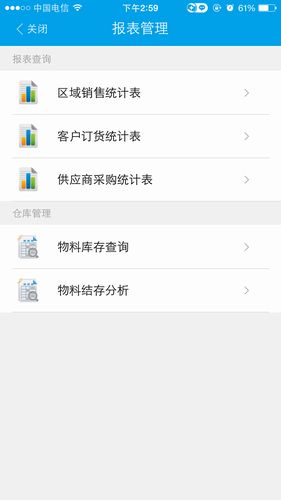 :點晴MIS信息通手機APP上提供了可以使用ERP/CRM/WMS/DRP等專業系統的哪些功能?![]() 為了方便購買了點晴ERP/CRM/WMS/DRP等專業系統的單位在手機APP上使用,點晴MIS信息通手機APP上提供了:客戶管理、訂單管理、報表管理三個大的功能模塊,各個模塊中的子功能如下: 客戶管理(CRM):添加新客戶、客戶信息查詢、添加新聯系人、聯系人信息查詢、新增拜訪計劃、查看&跟進拜訪計劃、新增拜訪記錄、查看歷史拜訪記錄; 訂單管理:微信訂單查詢(僅購買了DRP系統用戶)、銷售訂單查詢、采購訂單查詢、送貨單查詢、合并揀貨單明細管理、司機到貨確認; 報表管理:區域銷售統計表、客戶訂貨統計表、供應商采購統計表、物料庫存查詢、物料結存分析。 以上所列功能不是所有系統都有的,與具體購買的專業系統及其版本有關! 下面為相關界面截圖: ![]() 客戶管理: ![]() 訂單管理: ![]() 報表管理: ![]() 銷售訂單列表: ![]() 明細訂單瀏覽: ![]() 區域銷售統計: ![]() 更多詳細信息請自行登錄手機APP查看。