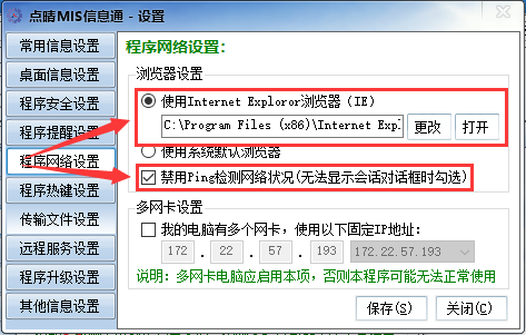 :信息通PC客戶端點擊主頁提示錯誤:無法打開窗口,找不到指定的文件,如何解決?![]() ![]() 出現這個提示的原因是用戶電腦上的IE瀏覽器被該電腦上的垃圾軟件360或搜狗惡意破壞了,導致使用默認路徑無法打開IE瀏覽器,點擊點晴MIS信息通設置-》程序網絡設置,選擇“使用系統默認瀏覽器”,或者升級點晴MIS信息通到最新版,上面會出現直接指定IE瀏覽器位置的項目,更改后保存,退出點晴MIS信息通,重新打開登錄,就會發現能夠正常打開瀏覽器了: ![]() 如果還是打不開,那么將下面那個“禁用Ping檢測網絡狀況”也勾選即可: ![]() 該文章在 2018/10/10 16:27:12 編輯過 |