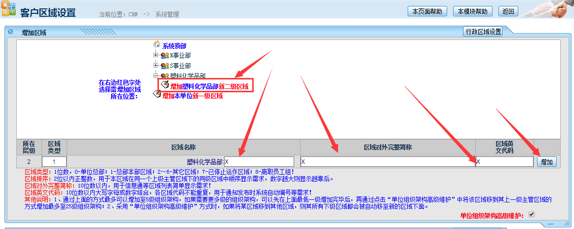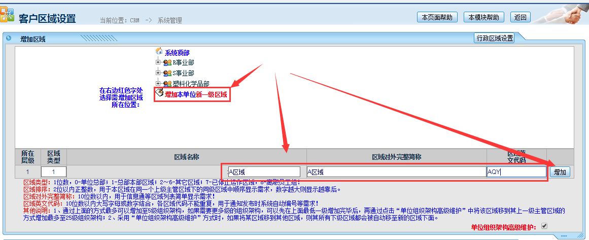 設(shè)置一級區(qū)域,點(diǎn)擊“增加單位一級區(qū)域”,錄入名稱等信息,點(diǎn)擊增加,如下圖: