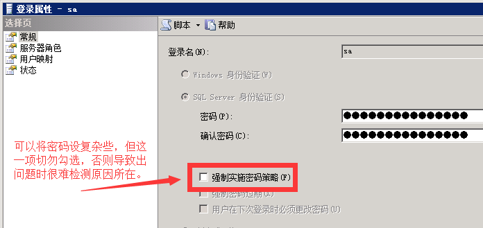 說明:上面中的Shared Memory、TCP/IP和Named Pipes三項都務必全部啟用,VIA切勿啟用,否則一定會導致登錄點晴OA緩慢無比! 2、打開SQL Server管理器Microsoft SQL Server Management Studio,優化其他參數 ![]() 右鍵點擊數據庫根目錄-》屬性: ![]() 不要勾選“強制實施密碼策略”,否則后續出現錯誤,很難查原因,管理員可將這個設置復雜些 ![]() 這兩項必須分別設置為:授予和啟用 ![]() 設置內存,最大服務器內存設置時切勿超過物理內存大小的75%,否則在服務器有大量訪問時,可能導致服務器長期失去響應,造成用戶更加瘋狂點擊,陷入惡性循環。 另外,要注意上面的單位是MB,不是KB,如果分配SQL Server最多使用512MB內存,那就應該設置為:512,而不是:512000! ![]() 設置處理器,勾選“提升SQL Server的優先級” ![]() 設置安全性,勾選上面兩項。 其余項目保持默認值即可。