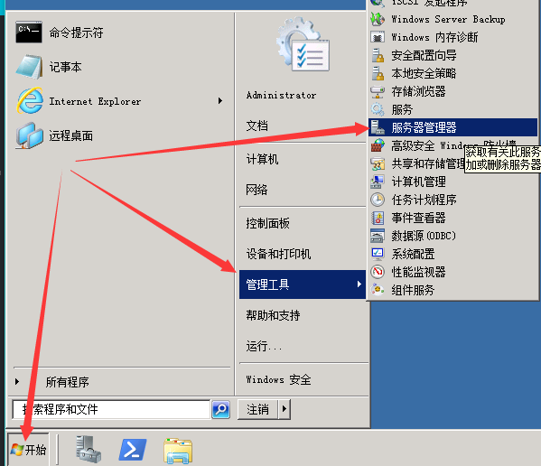 進入Windows Server服務器-》開始-》管理工具-》服務器管理器: