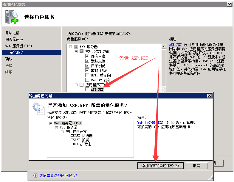 ![]() ![]() 勾選ASP.NET,會彈出一個窗口“添加角色向導”,點擊“添加所需的角色服務”: