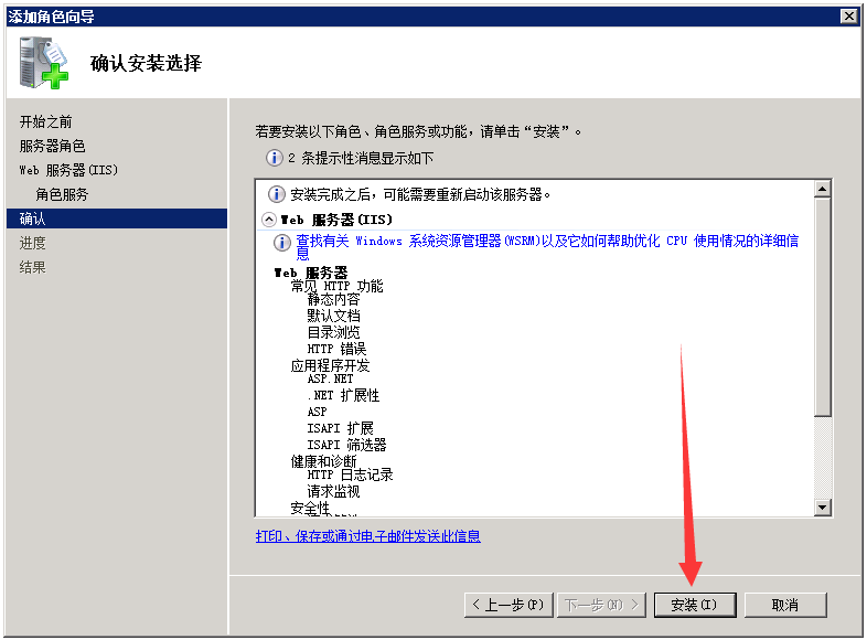 ![]() ![]() 特別說明: 勾選IIS服務項目時,務必嚴格按照以下“已安裝”紅色勾選項目設置,切勿勾選“未安裝”的項目,以免造成各種潛在的問題: ![]() 點擊“安裝”: