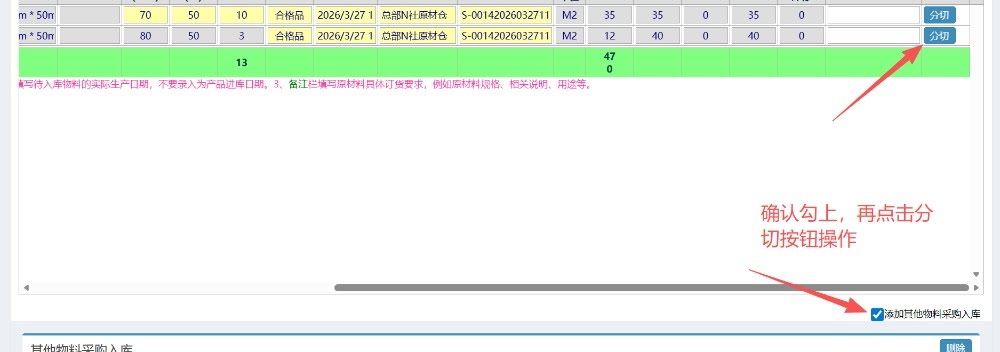 填入明細規(guī)格,點擊提交即可 注意:需要勾上下面的勾才能操作,否則點擊分切無效,如下圖 ![]() 方法2、
