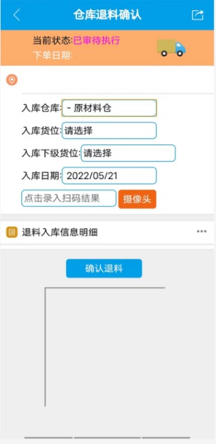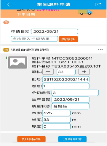 :點晴ERP-生產(chǎn)退料掃碼入庫![]() 生產(chǎn)退料掃碼入庫 1. 當工單生產(chǎn)結(jié)束時,若有剩余物料時,則需要進入申請退料.在本界面點擊攝像頭,掃描剩余物料上的標簽,然后填寫剩余的數(shù)量上去,最后點擊退料申請