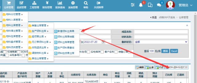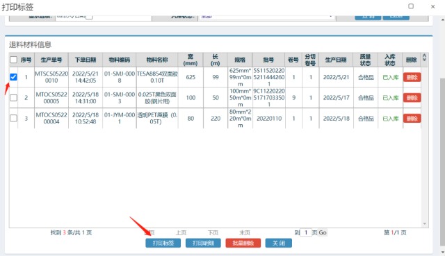 ![]() 2.點擊進入”物料出庫管理--->生產(chǎn)領(lǐng)料出庫---新增領(lǐng)料出庫單>”的界面,然后找到剛剛提交退料的信息,然后選中,最后點擊材料退料標簽打印 然后在彈出的窗口勾選出要打印的退料標簽,最后重新貼上在物料上.