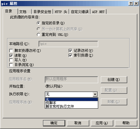 在IIS6.0中,對于站點每個文件夾,我們都可以在其屬性對話框中將執行權限設置為無,當程序對文件夾有寫入權限時,這個設置非常有用,它能防止用戶上傳腳本文件(.asp,.aspx)到服務器并運行:
