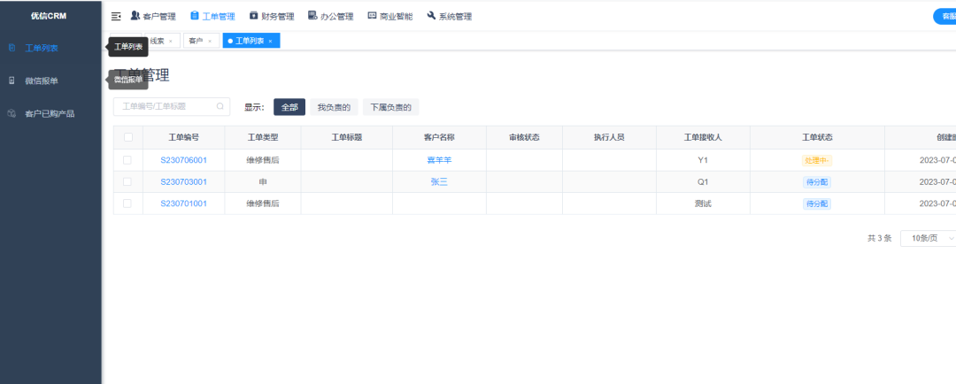 三、銷售管理 對于CRM客戶管理系統重要的就是銷售管理,包含銷售的目標,計劃,工作流程,跟進記錄,工作效果,都是可以在系統中看見的。 1、給銷售分配任務,線索和公??梢宰约侯I取可以自己分配,也可以自動回收,二次跟進。 2、外勤簽到,進行大地圖的精準定位。 3、規范銷售的工作流程,進行商機的二次跟進。 4、不同權限的分配,針對不同的銷售可以進行不同權限的分配 四、售后管理 這里使用的就是工單管理了,可以提高客戶的滿意度,客戶的退單,維修都是可以從系統中完成的。業務覆蓋不同的部門,進行全流程的閉環管理。