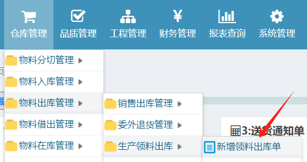 操作步驟,如下圖: 倉庫管理-物料出庫管理-生產(chǎn)領(lǐng)料出庫-新增領(lǐng)料出庫單