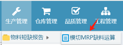 操作步驟:生產管理-模切MRP缺料運算,如下圖:
