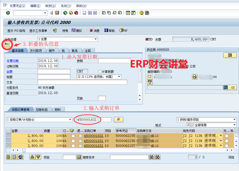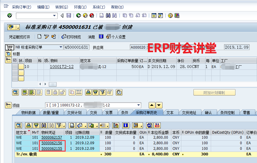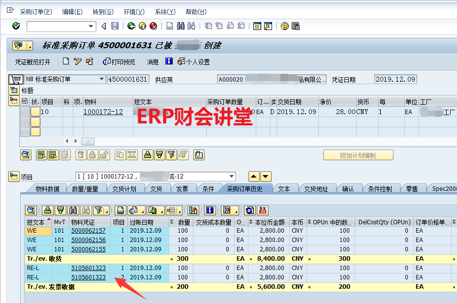 發票校驗是SAP采購流程中的重要環節,收到供應商發票之后,需要在SAP中匹配入庫記錄,并核對數量和金額是否正確,如有差異需要進一步確認原因,必要時將發票退回給供應商。 SAP中發票校驗可以通過事務碼MIRO由財務一步處理,也可以先由業務預制發票(MIR7),然后財務審核過賬發票(MIR4)。本文以MIRO為例,介紹SAP中發票校驗的具體操作。 系統中有如下采購訂單,數量為500,訂單收貨3次,每次數量100,查看采購訂單歷史如下圖。當前收到供應商發票,數量為200,接下來MIRO進行發票處理。 ![]() 第一步,匹配入庫憑證。