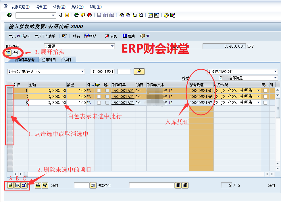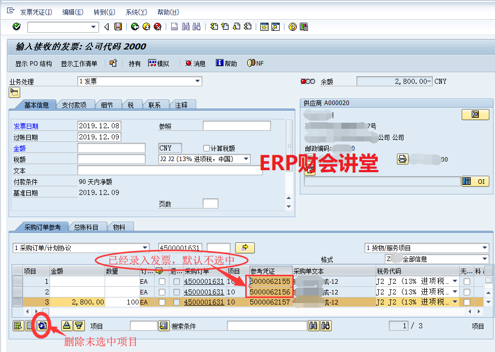 訂單的入庫數量為300,發票數量為200。并且再次對訂單錄入發票時,已經匹配發票的入庫憑證默認未選中,可以直接點擊右下角的圖標刪除項目。并且,通過后臺配置,可以實現一張物料憑證只能匹配一次發票,防止重復的發票校驗。