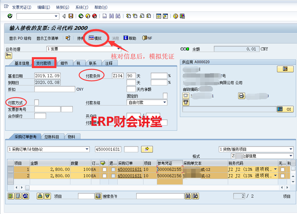 在上圖界面中,根據發票數量匹配入庫憑證,然后點擊右下角的圖標C刪除未匹配的行。接下來校對發票的金額是否正確,如果有差異需要確認原因。確認無誤后錄入發票的總額及稅金(下圖)。 ![]() 第二步,核對付款條件等信息。在“支付款項”頁中核對付款條件、付款方式等信息。通常這些信息由供應商主數據中帶過來,可以根據每次的實際情況進行調整。 ![]() 第三步,模擬發票。