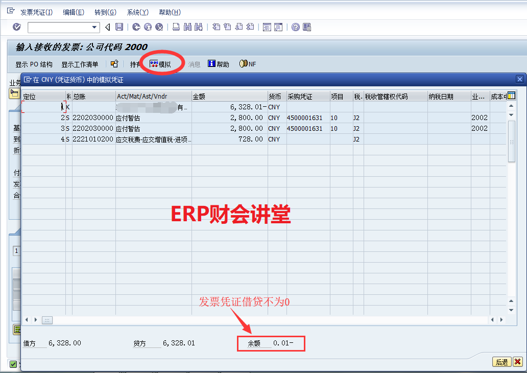 上圖錯誤原因為發票的借/貸余額不為0,系統沒有找到記錄差異的科目。更改發票金額使借/貸余額相等,再次模擬,“消息”處不再提示錯誤。