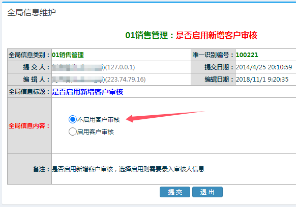 ![]() 在點(diǎn)晴ERP系統(tǒng)-》系統(tǒng)管理-》全局信息維護(hù)中,找到唯一識(shí)別號(hào)100221:是否啟用新增客戶審核: