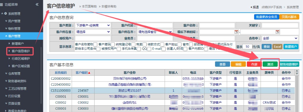 如果不需要審核,那么勾選“不啟用客戶審核”,有權(quán)限的用戶創(chuàng)建新客戶后,就可以直接生效使用了。 如果需要審核,那么勾選“啟用客戶審核”,有權(quán)限的用戶創(chuàng)建新客戶后,需要在點(diǎn)晴ERP系統(tǒng)-》系統(tǒng)管理-》客戶管理-》客戶信息維護(hù)中,找到這個(gè)客戶,點(diǎn)擊“激活”按鈕,將客戶更新為合作中狀態(tài),然后才能生效使用: