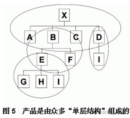 建立物料清單對實施ERP系統來講,是一項非常繁重的工作,如果能夠在CAD和PDM的基礎上,直接生成ERP所需要的制造BOM(M-BOM),減少重復勞動,對縮短產品上市周期,快速響應市場變化,都是極其重要的。尤其是單件小批生產的重型礦山機械、汽輪機、船舶等,也就是按定單設計(engineer to order,ETO)類型的機械制造業,企業信息化的步驟如果不是按先上CAD和PDM再上ERP這樣的順序實施,對實施ERP將是十分困難的,甚至會望而卻步。如果企業采用了CAD、PDM和ERP系統,但是相互之間不能集成,對企業信息化也將是一個難咽的苦果。 2、建立M-BOM 建立BOM,首先要對它的性質有一個正確的理解。 物料和由物料組成的“單層結構”是產品結構的基本單元。ERP把任何一個產品都看成是由若干個“單層結構”組成的,單層結構中的上層物料,稱為“母件(parent)”,下層物料稱為“子件(component)”。單層結構就是由一個母件和從屬于母件的一個或多個子件組成的。如果對應設計圖紙,母件指的是組裝圖上的裝配件,子件是零件明細表中眾多的零部件。不少企業在自行開發管理軟件時,由于沒有“單層結構”的概念,對所有產品的描述都從最頂層一直扎到最底層,相同的“單層結構”在各個產品文件中多次重復出現,數據的冗余量很大,極不合理。 以圖5的產品結構為例,X作為最上層的母件是一個要銷售出廠的產品,它由A、B、C、D四個子件組成。件X同件A、B、C、D組成一個“單層結構”。件B對應于X來講是子件,但它對應于件E、F來講又是母件,并一起組成一個第二個層次的單層結構。同理,件E同件G、H、I;件D同件I又組成位于不同層次的單層結構。任何一個產品都是由這樣眾多“單層結構”組成的。