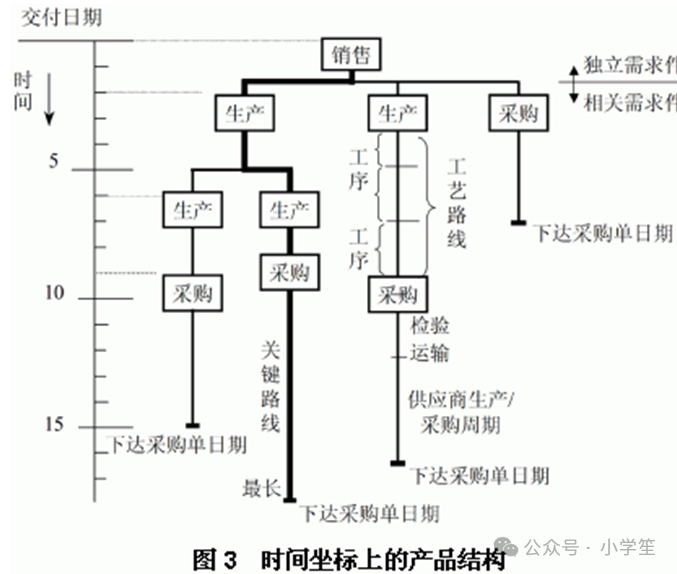 M-BOM首先應用于編制計劃,離不開“時間”概念,而E-BOM則無此需求。圖2中各個方框之間的連線表明生產或采購周期,長短是不一樣的,反映物料生成的過程。根據每一件物料的需求時間倒計時(提前期),求出下達定單或投料的時間,實現“優先級”計劃。理想的需求計劃是做到“不多不少不早不晚”,也就是準時制生產(JIT)的境界。把產品結構放在時間坐標上,即“時間坐標上的產品結構”,是集成銷售-生產-采購三項制造業主要核心業務信息的數據結構模型。見圖3。任何一個環節出現例外,在這樣集成銷產供業務的“一體計劃”模型基礎上,就能迅速做出調整,快速應變。圖3中最長的連線,是關鍵路線。如果要縮短交貨周期,首先要壓縮關鍵路線的長度;選擇交貨期短的供應商,選擇效率高的加工工藝。在其他分支流程上下功夫改進,最多只能降低成本費用,不能縮短總提前期。