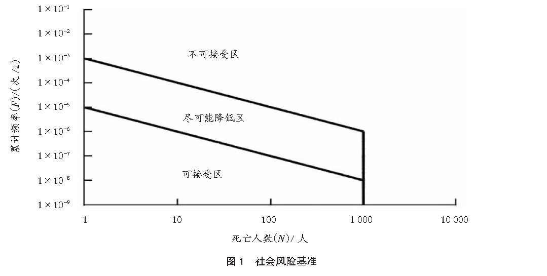 式中:R為網(wǎng)格點(diǎn)處的個(gè)人風(fēng)險(xiǎn);fS為泄漏場(chǎng)景發(fā)生頻率;PM為天氣概率;Pφ為風(fēng)向概率;Pi為點(diǎn)火概率;P個(gè)體風(fēng)險(xiǎn)為網(wǎng)格點(diǎn)的死亡概率。個(gè)人風(fēng)險(xiǎn)通常以個(gè)人風(fēng)險(xiǎn)等值線表示,將相同個(gè)人風(fēng)險(xiǎn)的網(wǎng)格點(diǎn)相連繪制成個(gè)人風(fēng)險(xiǎn)等值線,與表1中的個(gè)人風(fēng)險(xiǎn)基準(zhǔn)進(jìn)行比對(duì),得出個(gè)人風(fēng)險(xiǎn)是否可接受的結(jié)論。2.3 社會(huì)風(fēng)險(xiǎn)計(jì)算模型在計(jì)算社會(huì)風(fēng)險(xiǎn)時(shí),在個(gè)人風(fēng)險(xiǎn)計(jì)算確定的各泄漏場(chǎng)景、天氣等級(jí)(M)、風(fēng)向(φ)、點(diǎn)火事件(i)的基礎(chǔ)上,確定網(wǎng)格點(diǎn)內(nèi)的人數(shù)Ncell,得到對(duì)應(yīng)的網(wǎng)格點(diǎn)的人口死亡百分比(P社會(huì)風(fēng)險(xiǎn))。計(jì)算死亡總?cè)藬?shù)(∑所有網(wǎng)格單元P社會(huì)風(fēng)險(xiǎn)×Ncell)≥N的所有事故發(fā)生的頻率(FN),并進(jìn)一步構(gòu)造社會(huì)風(fēng)險(xiǎn)F-N曲線,根據(jù)F-N曲線所處區(qū)域,與圖2社會(huì)風(fēng)險(xiǎn)基準(zhǔn)進(jìn)行比對(duì),得出社會(huì)風(fēng)險(xiǎn)是否可接受的結(jié)論。社會(huì)風(fēng)險(xiǎn)計(jì)算公式為