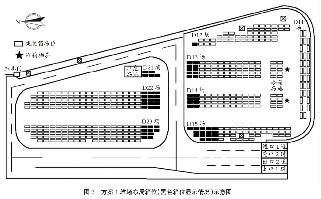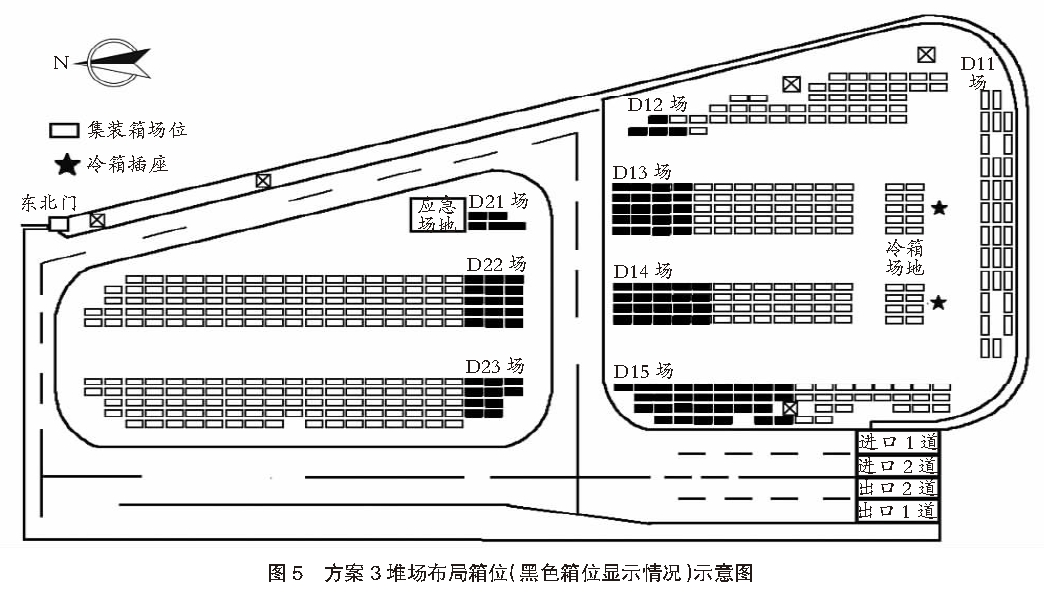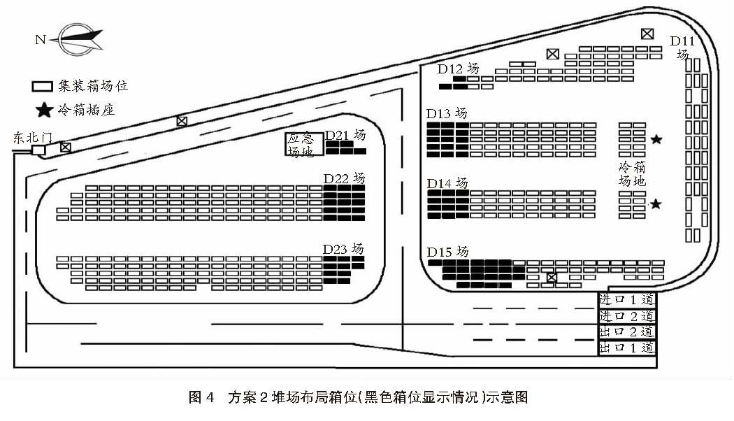 - 方案2:-18 ℃≤閃點(diǎn)<29 ℃,總箱量不大于164 TEU。儲(chǔ)存區(qū)域?yàn)椋篋11不堆存;D12堆存6 TEU(由北至南2列共3個(gè)箱位);D13堆存30 TEU(由北至南3列共15個(gè)箱位);D14堆存24 TEU(由北至南3列共12個(gè)箱位);D15堆存44 TEU(由北至南1~6列共20個(gè)箱位,第7列西側(cè)2個(gè)箱位);D21~D23堆存60 TEU。總計(jì)共164 TEU。方案2堆場(chǎng)布局箱位(黑色箱位顯示情況)示意圖見(jiàn)圖4。