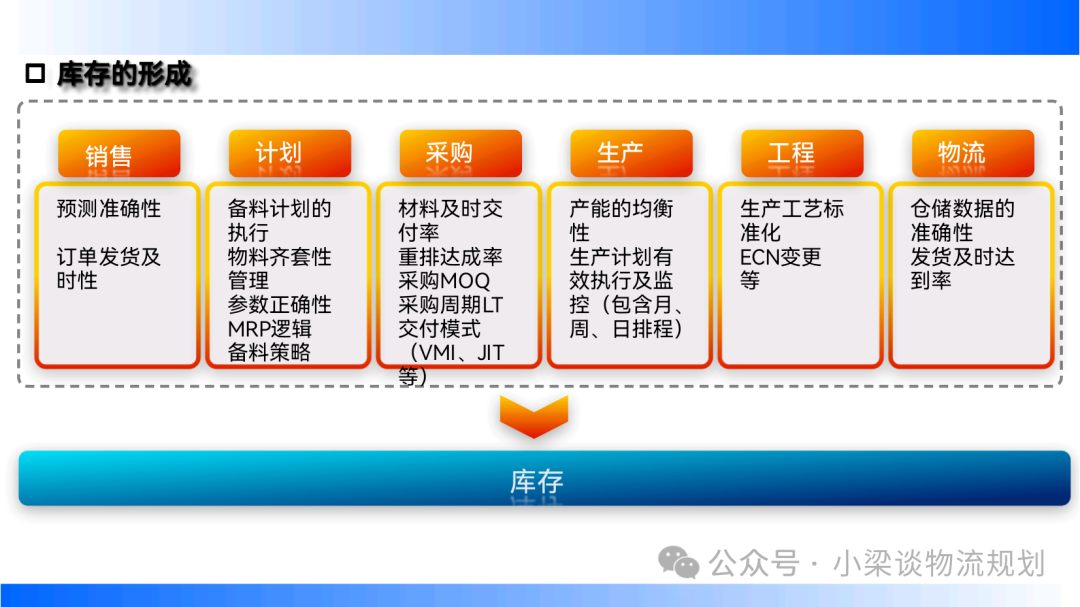 前言: 制造業企業對庫存管理要避免“三高”,高庫存,高風險,高浪費,需降低庫存成本、控制運營風險、消除生產浪費。打通業務流程,實現物流一體化運作和管理。物料計劃與控制要符合 MMOG/LE 要求,包括改進物流策略、組織工作、產能和生產規劃、與顧客和供應商接口等。實物流與信息流合一要保證發運計劃、穩定生產計劃、狠抓配套計劃、拉動供應商到貨計劃,并進行差異管理。一、庫存類別概覽