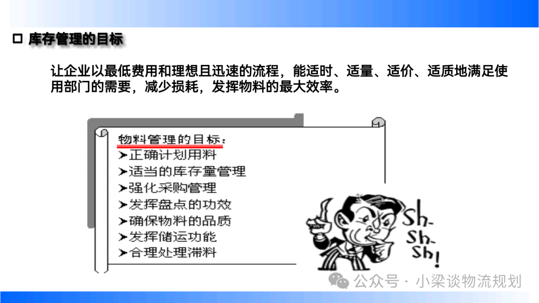 - 庫存控制:旨在維持合理庫存水平,以最少的投資與管理費用,滿足需求,減少缺貨損失。