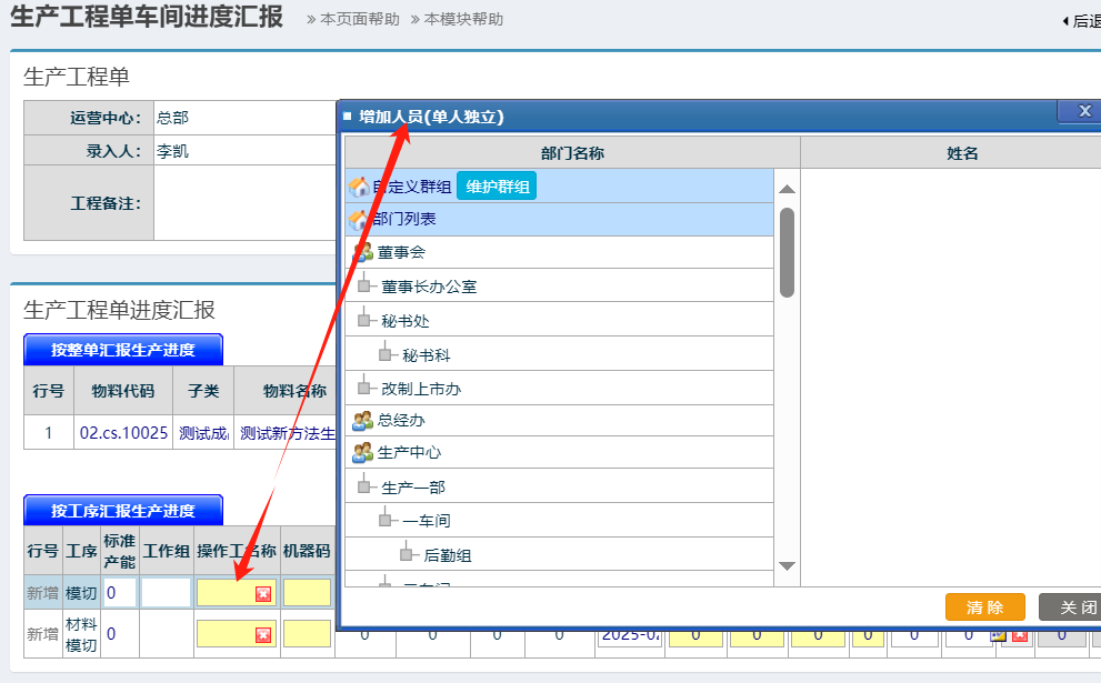 工藝資料的生產模式為單人獨立時,生產匯報時的操作人只能選一個 如下圖: