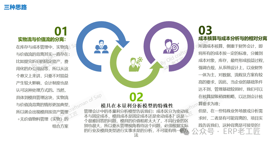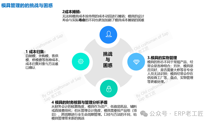 綜上,由于模具不同于物料,也不同于資產(chǎn),在不同的行業(yè)中,模具的成本占比大小不同,因此,模具管理是項(xiàng)目方案設(shè)計(jì)的難點(diǎn)之一,大概可以總結(jié)為以下幾點(diǎn):1.模具成本歸集困難:自制模,外購(gòu)模,客供模,修模費(fèi)等各種成本,由于不是公司的主流生產(chǎn),用哪種方式來歸集成本是個(gè)難題,尤其是在多系統(tǒng)集成本數(shù)字化公司;2.模具成本攤銷方法困難:模具是生產(chǎn)產(chǎn)品組件的成本組成,而一般的成本核算是以成品或半成品為成本對(duì)象,這就天然的造成了模具成本攤銷的困難---無法將模具成本按傳統(tǒng)的成本動(dòng)因(Cost Driver)進(jìn)行攤銷;同時(shí),模具的設(shè)計(jì)壽命與實(shí)際壽命的不同---這是模具的常態(tài),也更加加劇了模具成本攤銷的困難。3.模具的實(shí)物管理困難:模具的形態(tài)不同于常規(guī)產(chǎn)品,經(jīng)常會(huì)是各種組合;另外,模具是否完好,是否需要大修等非專業(yè)人員無法識(shí)別;模具經(jīng)常會(huì)存在供應(yīng)商工廠等,盤點(diǎn)、實(shí)物管理等更難處理;從財(cái)務(wù)會(huì)計(jì)的核算角度,模具作為資產(chǎn),低值易耗品,輔料或直接費(fèi)用化;但從管理會(huì)計(jì)角度,模具需要按產(chǎn)品組(項(xiàng)目),跨周期進(jìn)行全生命周期管理。口徑與方法的不同,給模具管理帶來新的挑戰(zhàn)!復(fù)雜的場(chǎng)景,成本歸集與攤銷,實(shí)物管理的種種困惑,告訴我們?cè)O(shè)計(jì)流程與方案時(shí)必須面對(duì)的事實(shí),事實(shí)上,我們沒有辦法設(shè)計(jì)統(tǒng)一的方案滿足各種場(chǎng)景---無論技術(shù)多么先進(jìn)完美,面對(duì)這類復(fù)雜的業(yè)務(wù)場(chǎng)景時(shí),首先應(yīng)該從管理入手,從管理視角,梳理一下管理的思路—特別是面對(duì)這種場(chǎng)景與需求時(shí),必須改變的或提升的觀念,然后再考慮技術(shù)實(shí)現(xiàn)手段。這是我解決這類復(fù)雜需求的常用方法。在庫(kù)存與成本管理中,實(shí)物流與價(jià)值流的背離其實(shí)一直存在:比如提完折舊的固定資產(chǎn),費(fèi)用化的辦公用品等,所以從這個(gè)意義上來講,只要不對(duì)損益產(chǎn)生較大影響,會(huì)計(jì)制度也是認(rèn)可這種處理方式的。當(dāng)然,具體到模具管理這塊,實(shí)物流與價(jià)值流背離的情形更加典型,所以就會(huì)出現(xiàn)模具按資產(chǎn)管理+無價(jià)值物料管理(實(shí)物)的組合方案。管理會(huì)計(jì)中的本量利分析模型告訴我們:成本區(qū)分為變動(dòng)成本與固定成本,模具成本到底是屬于固定成本還是變動(dòng)成本?這是一個(gè)很難回答的問題,模具的價(jià)值相差太大了,不同行業(yè)的區(qū)別也很大,所以要從管理視角看待這個(gè)問題,必須根據(jù)實(shí)際的行業(yè)及模具類型進(jìn)行實(shí)事求是的分析,不可能有統(tǒng)一的方法。成本核算(FI核算)與成本分析(CO管報(bào))與的相對(duì)分離:所謂成本核算,側(cè)重于財(cái)務(wù)會(huì)計(jì),即將所有的成本按一定的標(biāo)準(zhǔn),分?jǐn)偟匠杀緦?duì)象,庫(kù)存,最終形成損益過程,強(qiáng)調(diào)合規(guī),從系統(tǒng)設(shè)計(jì)上,以業(yè)財(cái)務(wù)一體為主,對(duì)數(shù)據(jù)、流程及方案有較高的要求,因此,當(dāng)企業(yè)的基礎(chǔ)條件達(dá)不到,管理基礎(chǔ)較弱時(shí),我們可以在核算層級(jí)稍微粗略,以達(dá)到會(huì)計(jì)核算要求為準(zhǔn)。而成本分析以內(nèi)部管理考核為準(zhǔn),按照“數(shù)據(jù)同源”的原則,數(shù)據(jù)來源應(yīng)該與成本核算同維度,同口徑。但是,在一些特殊業(yè)務(wù)場(chǎng)景或分析需求時(shí),二者是有可能背離的,項(xiàng)目實(shí)踐告訴我們,這種背離是可接受的! 成本分析需求在事后通過開發(fā)報(bào)表或其他技術(shù)工具方式實(shí)現(xiàn)。這樣做,最大好處理對(duì)數(shù)據(jù)流程的依賴性有所降低,同時(shí)也基本滿足了成本核算與成本分析的需求。這就是所謂的成本核算與成本分析的相對(duì)分離的概念。在考慮模具處理方案時(shí),也有必要參考這種管理理念,問題就會(huì)變得好理解一些。甚于于以上痛點(diǎn)及解決思路,初步小結(jié)以下7種解決方案:方案1按固定資產(chǎn)管理:按套模具建立資產(chǎn)卡片,在資產(chǎn)使用期內(nèi),按月攤銷折舊成本,這種情況下,折舊成本一般作為“公共”的費(fèi)用,平均攤銷給該產(chǎn)線的所有產(chǎn)品,一般是按機(jī)器工時(shí)分?jǐn)偂_@種方式,一般適用于金額較大的壓鑄模,注塑模等。從“成本分析”來看,這種方式,有明顯的管理缺陷,模具的成本沒有攤銷到正確的成本對(duì)象上,攤銷金額也經(jīng)常背離模具的使用周期。方案2按庫(kù)存物料管理+領(lǐng)用直接費(fèi)用化:模具在入庫(kù)時(shí),作為庫(kù)存物料,領(lǐng)用時(shí),一次性作為費(fèi)用消耗處理。這種方式僅適用于單價(jià)較小,數(shù)量眾多的塑膠玻璃木質(zhì)模具,這類模具大多類似于工裝夾治具。優(yōu)點(diǎn):核算簡(jiǎn)單方便缺點(diǎn):費(fèi)用分?jǐn)偛粔驕?zhǔn)確,也不利于實(shí)物庫(kù)存管理。事實(shí)上,為了準(zhǔn)確分?jǐn)偝杀荆陧?xiàng)目中,可能有各種變通的開發(fā)方案輔助方案3:以模