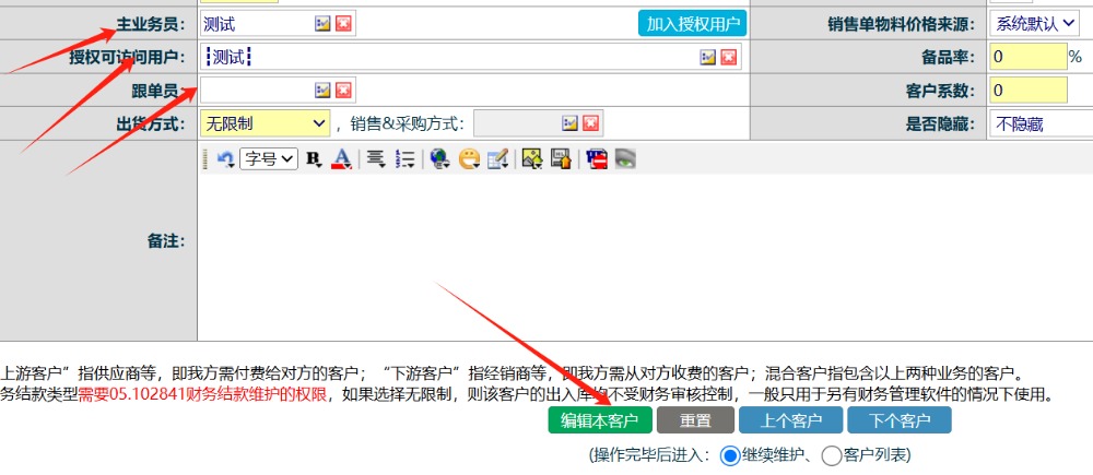 2、設置客戶資料業務員綁定,以及訪問權限,操作步驟如下: ERP-系統管理-客戶管理-客戶信息維護