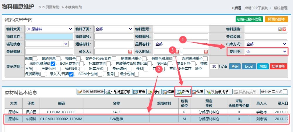 找到需要作廢的物料代碼,然后點擊“作廢”按鈕,就可以將這個物料代碼作廢了。 注意,如果這個物料還有進行中的訂單、倉庫庫存等,則禁止作廢此物料代碼,必須先處理結案完畢所有的訂單和倉庫庫存后,才允許作廢此物料代碼。 二、物料代碼激活重用方法 如果已經作廢停用的物料代碼想重新恢復使用,那么還是進入ERP系統-》系統管理-》物料管理-》物料信息維護:? ![]() 查詢條件中,使用中務必選擇為“否”,然后查出已經作廢的物料代碼,點擊上面的“激活”按鈕,就可以重新將此物料代碼投入使用了。 點晴模切ERP更多信息:https://moqie.clicksun.cn,聯系電話:4001861886 該文章在 2025/7/11 16:58:07 編輯過 |
