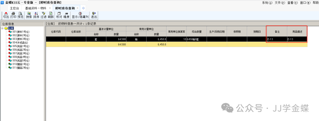 在金蝶KIS云·專業(yè)版的標準功能中,并未直接提供倉位管理的功能。然而,近期通過與客戶的交流,我意外發(fā)現(xiàn)了一個巧妙的解決方法。在金蝶KIS云·專業(yè)版的物料屬性中,有兩個名為“備注”和“商品描述”的字段。這兩個字段填寫的內(nèi)容能夠自動同步到即時庫存表中。基于這一特性,我們可以在“備注”或者“商品描述”字段中填入倉位信息,從而輕松實現(xiàn)倉位管理。