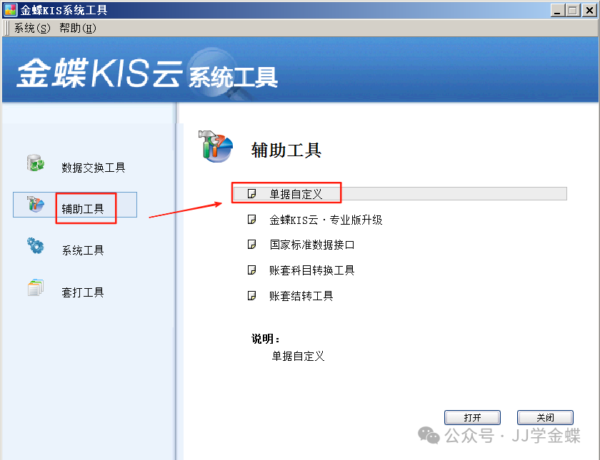 2、在【系統(tǒng)工具】-【輔助工具】里點擊【單據(jù)自定義】;