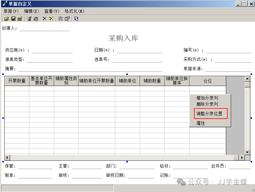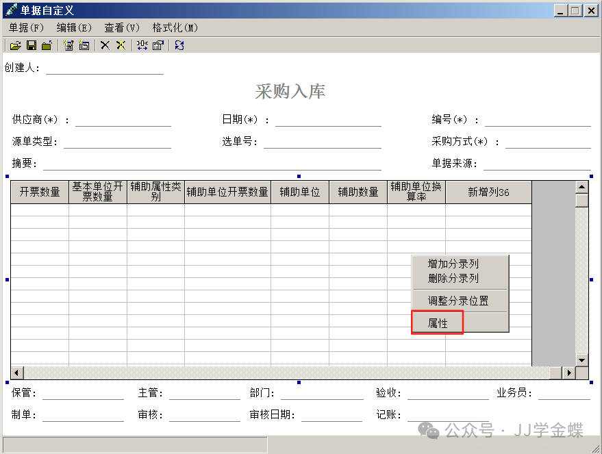 5、接下來我們設置新增分錄列的屬性(名稱及取數(shù)來源); a、在采購入庫單表體鼠標右鍵點擊“屬性”,找到新增的分錄列;