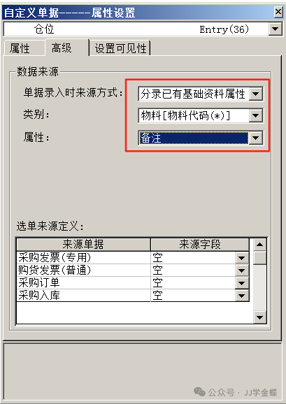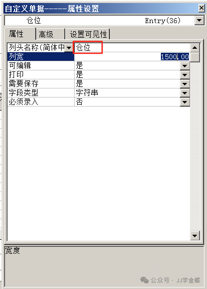 c、在“倉位”分錄列的“高級”屬性頁簽設置取數(shù)來源,如果倉位寫在“商品描述”字段,也可以將“屬性”改成“商品描述”;