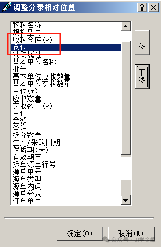 d、通過“調(diào)整分錄位置”將新增的“倉位”列調(diào)整到“收料倉庫”后面然后點擊“確定”。