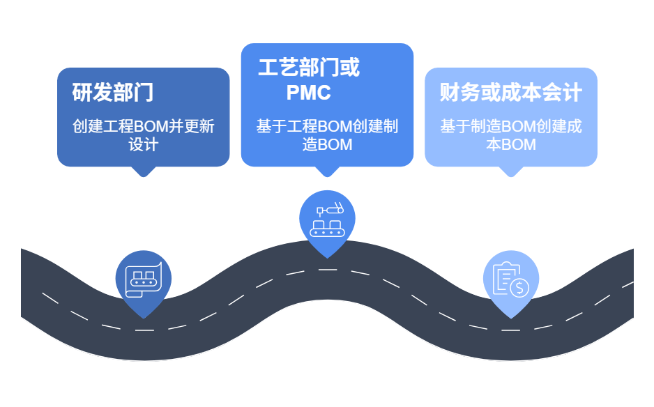 三種BOM到底怎么配合跑? 說到底,BOM管理的關鍵不在于“哪一張才對”,而在于“誰看什么、系統怎么看、什么時候用哪一張”。 要讓ERP真的跑順,必須做到——三種BOM職責清晰、數據流通、系統配置合理。 我們來模擬一個標準工廠的流程: 先是研發部門建好工程BOM,定義好每一個成品的結構、子件、圖紙、標準,保存在PDM或PLM系統中。它關注的是“產品設計對不對”。 接下來,工藝部門或PMC會基于工程BOM,整理出制造BOM,加上生產順序、加工路徑、裝配步驟、替代料、工藝路線等內容,輸入到ERP系統的生產模塊中。它關心的是“怎么做最順、效率最高”。 最后,到了財務或成本會計這邊,會基于制造BOM,結合實時的材料單價、人工工時費、制造間接費用等,生成一套成本BOM,用來核算單位成本、評估利潤空間、制定報價策略。它關注的是“這產品做下來到底賺不賺錢”。