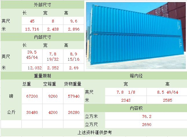 照片名稱:45'HQ(High Cube Container 高柜) 備注:正常裝貨78CBM
