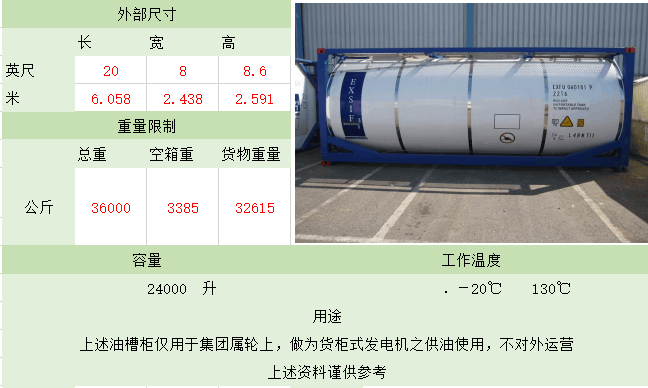 照片名稱:20'ISO TANK(罐式集裝箱) 備注:這種集裝箱是專為裝運(yùn)液體貨物,如酒類、汽油、化學(xué)品而設(shè)計的