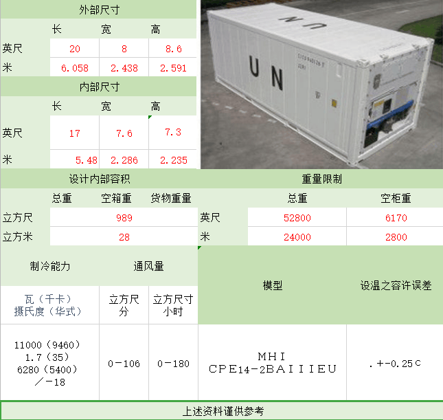 照片名稱:20'Refrigerated(冷凍柜) 備注:專為運(yùn)輸如魚、肉、新鮮水果、蔬菜等食品而特殊設(shè)計的