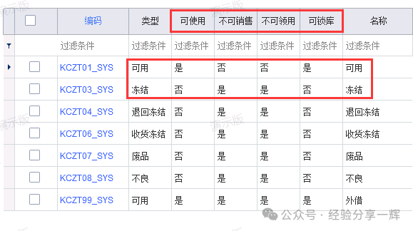 庫存狀態(tài)轉(zhuǎn)換單:把(物料)的狀態(tài)轉(zhuǎn)換,不同的狀態(tài)有不同的作用。(如:可用狀態(tài),可使用,可鎖庫,凍結(jié)狀態(tài),不可銷售,不可領(lǐng)用)