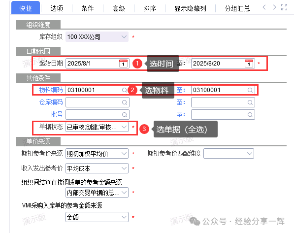 舉個(gè)例子:查物料(成品A)8月的出入庫數(shù)據(jù)。 查詢?nèi)掌冢哼x8月1號(hào)至月底。 其它條件:只查一個(gè),選(物料編碼), 單據(jù):默認(rèn)是審核,也可全選。