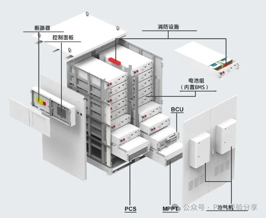 為了便于更多人理解儲(chǔ)能系統(tǒng)的組成,我這里放了2張不同企業(yè),小型儲(chǔ)能系統(tǒng)和大型儲(chǔ)能系統(tǒng)的結(jié)構(gòu)組成示意圖。