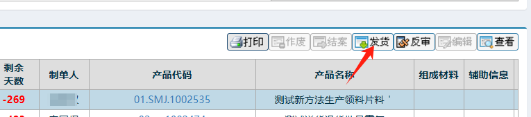 :點晴ERP-調撥出庫單-發貨操作![]() 點擊進入 如下圖; 點擊一條信息后,背景變色后,點擊發貨按鈕 如下圖: