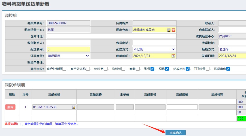 點晴模切ERP-調撥出庫單-發貨操作