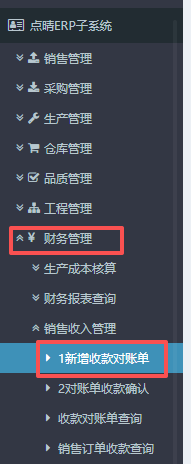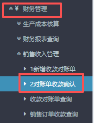 4.提交后,回到左側(cè)的功能菜單找到“財務(wù)管理”,點擊“銷售收入管理”,點開“對賬單收款確認(rèn)”。