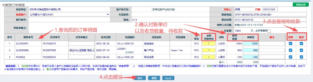 3.查詢之后,在下方會得出對應(yīng)的收款對賬單,確認(rèn)對賬單價以及收貨數(shù)量、待收款,點擊確認(rèn)復(fù)核和收款,最后點擊提交。