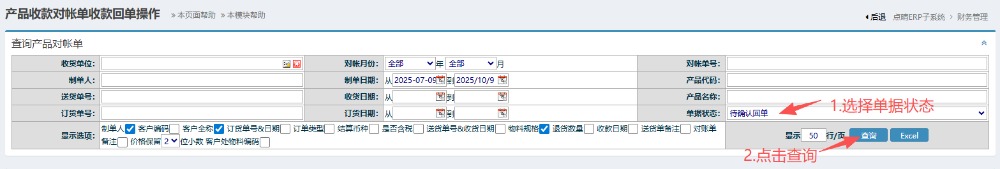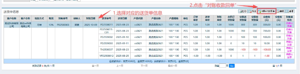 6.查詢得到當(dāng)前的單據(jù)狀態(tài),選擇對應(yīng)的送貨單信息,點擊“對賬收款回單”。