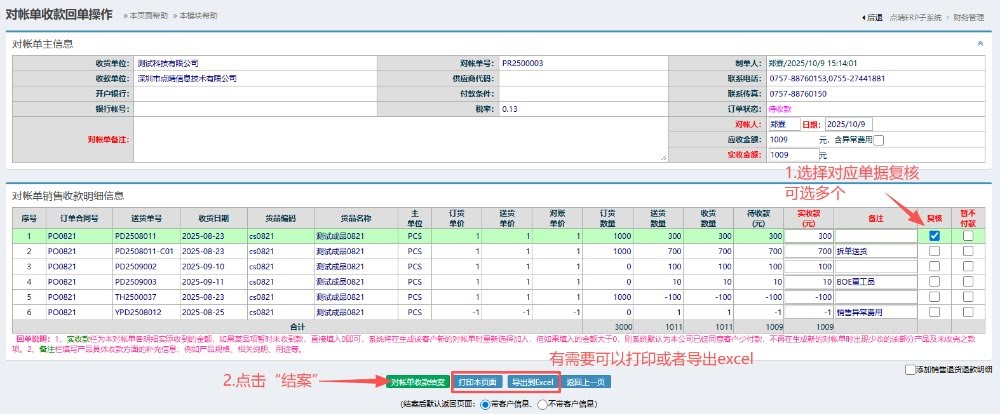 接著會跳轉(zhuǎn)到另一個頁面,選擇對應(yīng)單據(jù)然后點擊復(fù)核,最后點擊“對賬收款單結(jié)案”。 注:有需要可以進(jìn)行打印或者導(dǎo)出excel ?![]() 點晴模切ERP更多信息:https://moqie.clicksun.cn,聯(lián)系電話:4001861886 該文章在 2025/10/9 16:16:35 編輯過 |