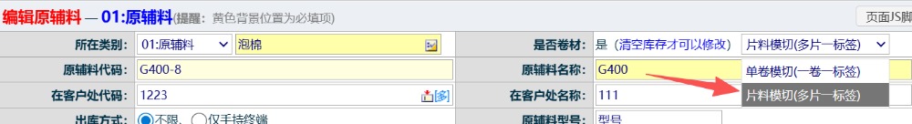首先資料需創建(修改)成卷料屬性,按片料管理 進入界面后,選擇對應的資料,點擊編輯按鈕 確保資料設置為卷料屬性,按片料管理后點擊提交 ![]() 點晴模切ERP更多信息:https://moqie.clicksun.cn,聯系電話:4001861886 該文章在 2026/1/8 17:11:43 編輯過 |